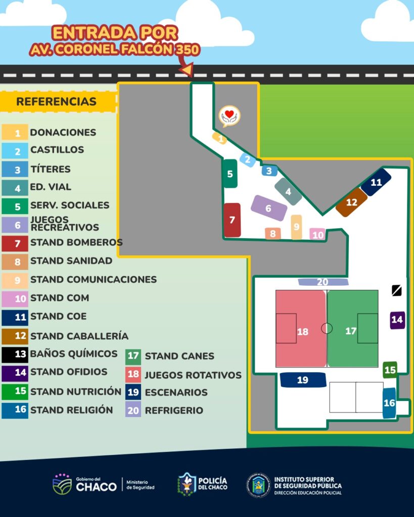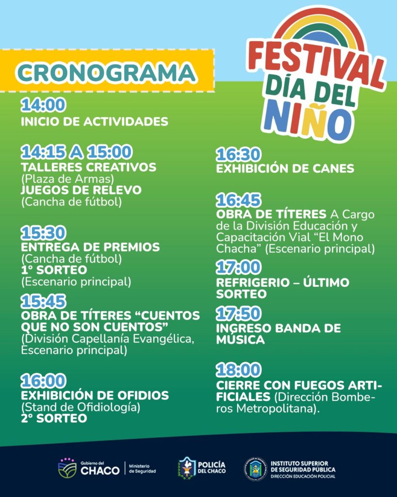 Invitamos a la familia policial y civil contratada de la Policía del Chaco a participar del Festival “Día del Niño”, que se realizará en el predio de la Escuela de Policía ISSPCHACO (Av. Coronel Falcón 350, Resistencia), el día sábado 30 de agosto, de 14:00 a 18:00 horas.